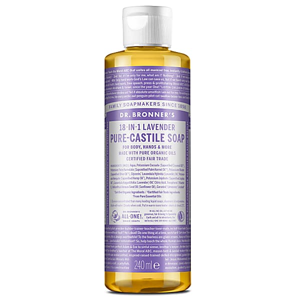 Scented with pure lavender and lavandin oils to calm the mind and soothe the body! Dr. Bronner’s Pure-Castile Lavender Liquid Soap is concentrated, biodegradable, versatile and effective