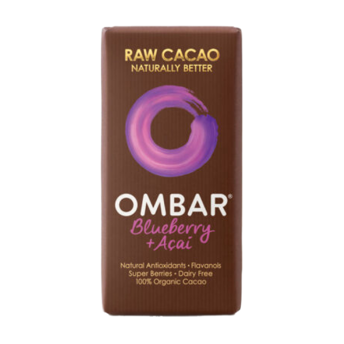 Ombar Acai & Blueberry bar is a delicious and nutritious way to enjoy chocolate. Unlike sugar rich, fatty chocolate bars, Ombar is different – containing only natural ingredients and is not greasy to the touch.The Acai and Blueberry Bar is sweetened with coconut sugar. This is not the same as cane sugar, it is low GI which is better than agave nectar. The main ingredient of this chocolate, the cacao bean is recognised as a fantastic superfood. It is believed to have many beneficial properties such as improving your mood and increasing your energy levels. Most importantly it contains flavonoids, which have many antioxidant properties. Similarly, The acia berry and the blueberry are high in antioxidants, vitamins and minerals.