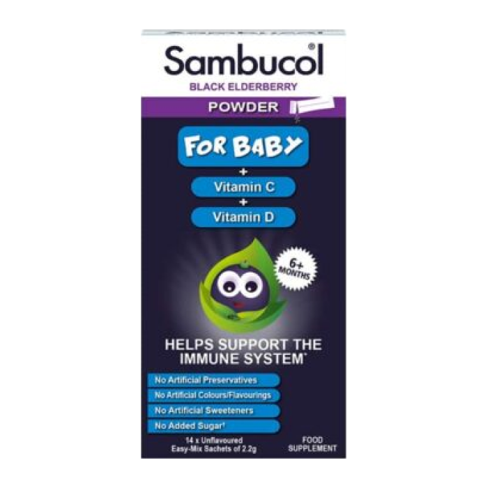 Help support your baby’s immune system with Sambucol Baby Powder containing natural Elderberries plus Vitamin C and Vitamin D3. Each pack contains 14 x 2.2g sachets.