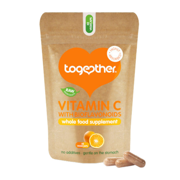 Vitamin c with bioflavonoids incorporated in citrus pulp. Vegecap (vegetable cellulose)